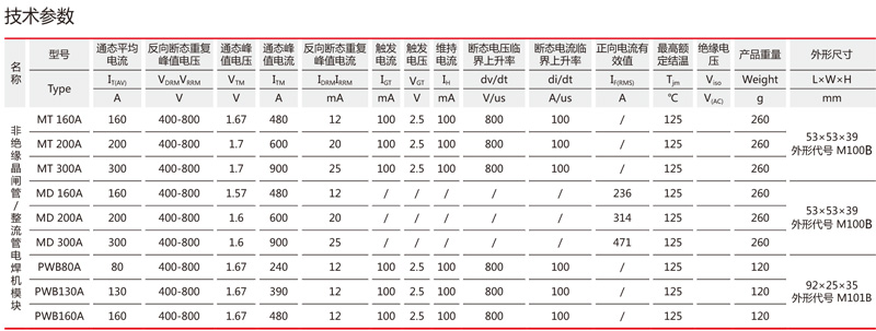 產(chǎn)品特性:●體積小,標(biāo)準(zhǔn)封裝;● 非絕緣,底板為共用極;● 真空+ 充氫保護(hù)焊接技術(shù);● 優(yōu)良的溫度特性和功率循環(huán)能力;● 高浪涌電流,低正向壓降。產(chǎn)品應(yīng)用:●電焊機(jī)電源.● 各種DC 電源.● 變頻器。產(chǎn)品代號(hào):M100B、M101B